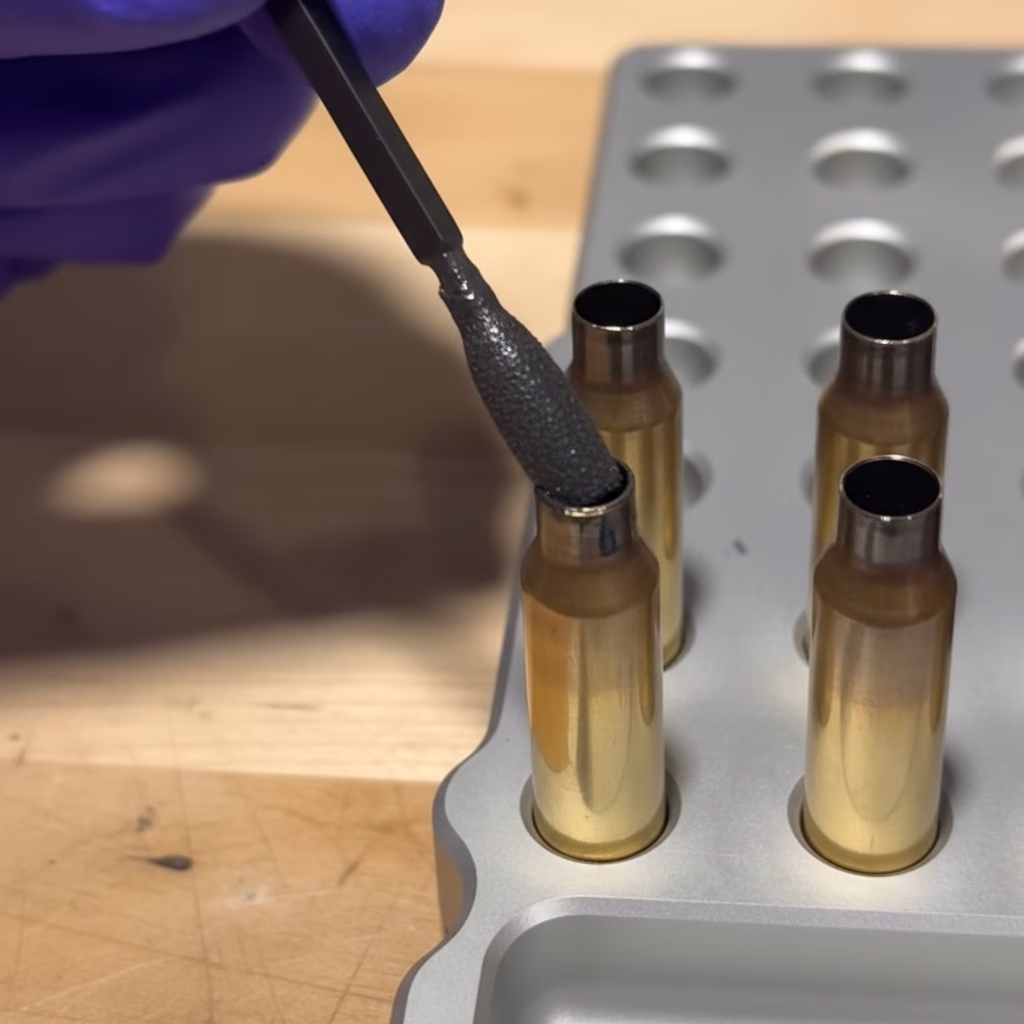 Apply a thin, even film to the interior of the case neck. Allow solvent to flash off before sizing or seating.